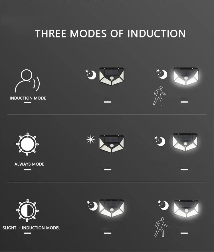 4.【3 Intelligent Modes】The 100 LED Solar Light have 3 Modes, you can choose the perfect mode according to your diverse needs. Medium light mode, Dim light sensor mode and sensor mode.