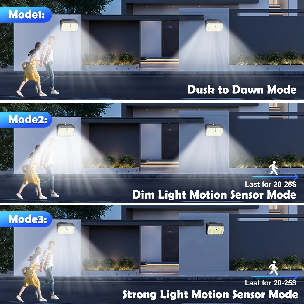 【3 INTELLIGENT LIGHTING MODES: 1-Always On Mode: The outdoor solar lights motion sensor & solar garden lights will remain at 30% brightness for the whole night; 2-Dusk to Dawn Sensor Mode: The outdoor solar lights turns to 100% brightness when motion is detected, and stays at 30% when the object leaves; 3-Montion Sensor Mode: The solar security lights outdoor motion sensor & solar lights outdoor garden lights remains at 100% brightness when motion is detected. The the solar security lights outdoor motion sensor will automatically turn off when the object leaves. Choose a mode of the solar security lights outdoor motion sensor. Let the solar security lights outdoor motion sensor be on for you!