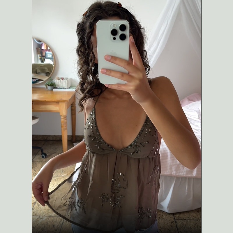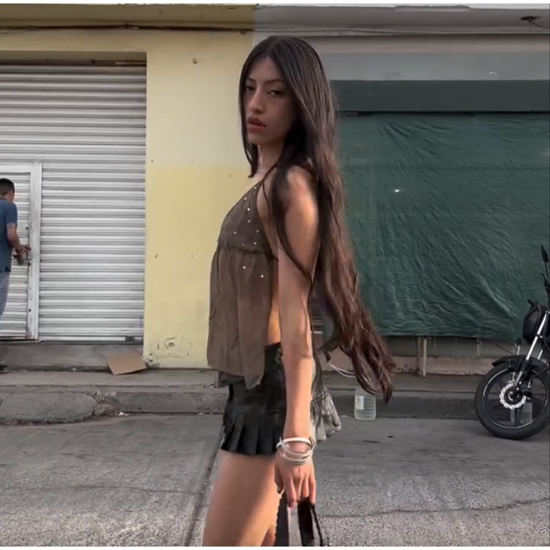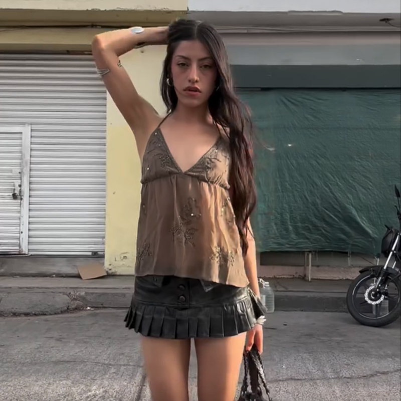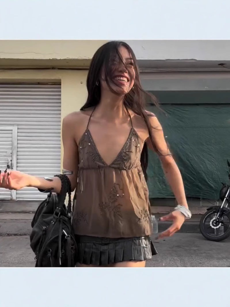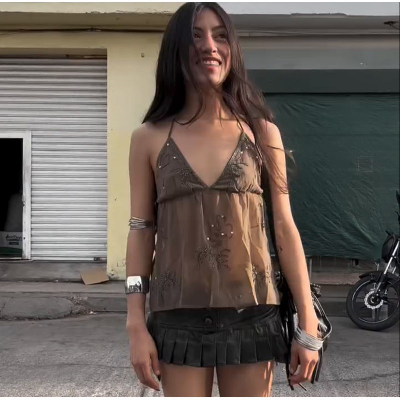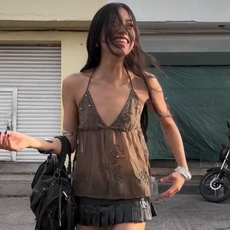 Solid Color Beaded Lace-Up Short V Neck Halter Top Simple Sexy Style 2025 Cross-Border European And American Summer New Style